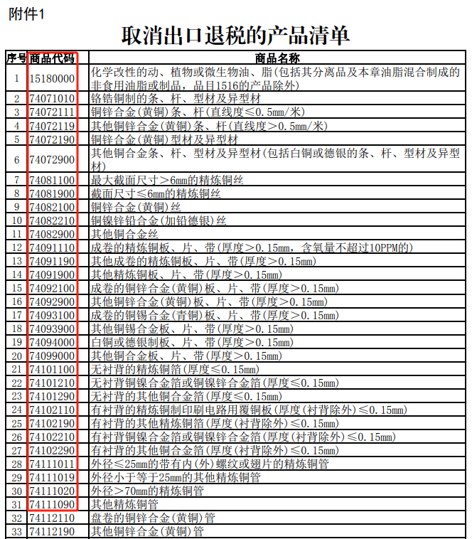 关于打消出口退税的产物清单,总共包含59个产物,除了通知布告提到的产物,好比精辟铜管、铜板,其他铜合金条等。